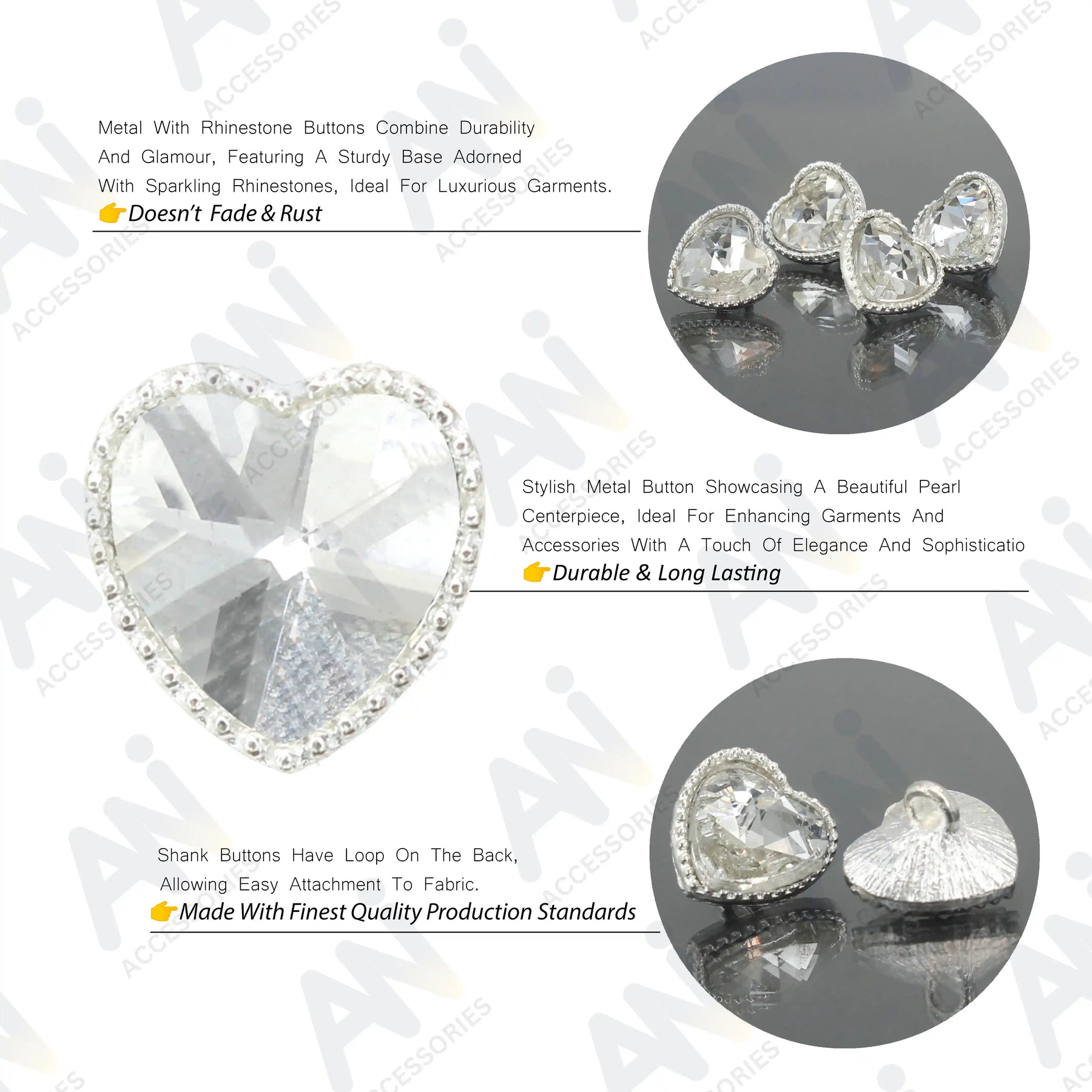 Enhance your garments with Heart Shape Shank Buttons, perfect for adding a premium, eye-catching look. These buttons are both stylish and durable, and come in silver color with an edge-to-edge design, crafted from premium, high-quality metal.