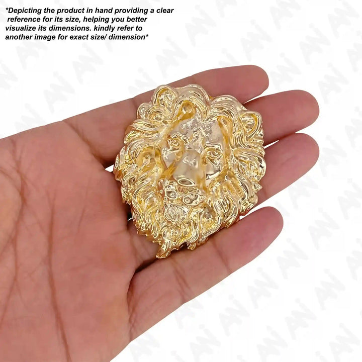 Gold lion brooch displayed in hand showcasing intricate details and craftsmanship