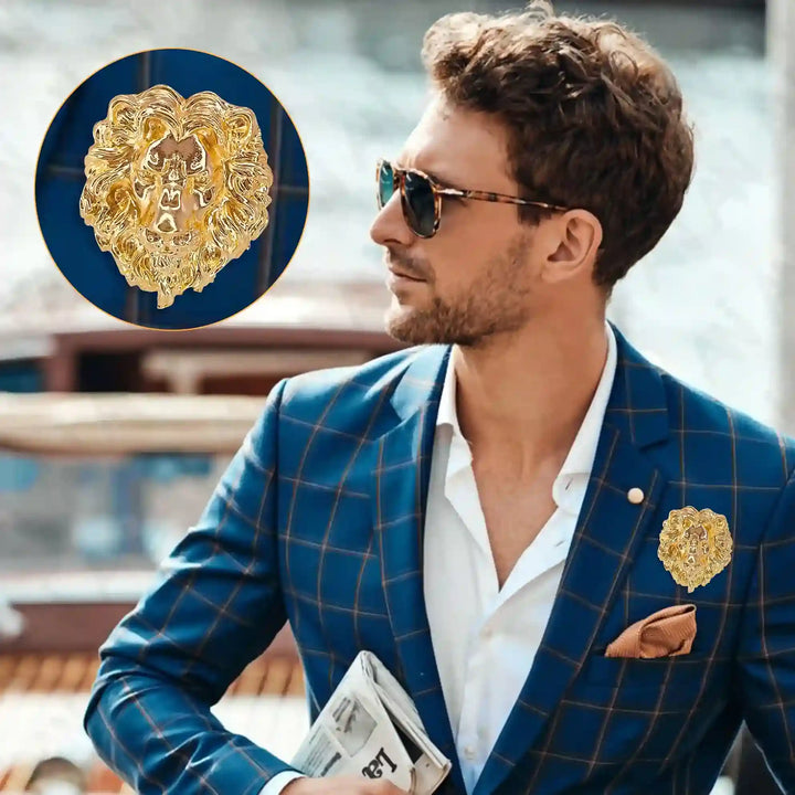 Elegant gold lion brooch on a stylish suit, perfect accessory for a sophisticated look