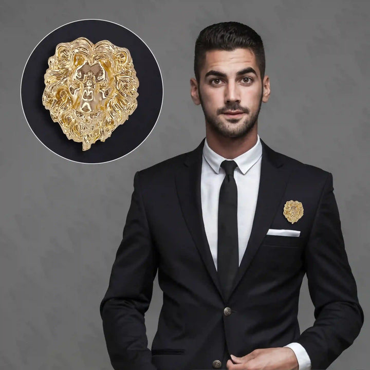 Stylish man wearing a gold lion brooch on a black suit for a sophisticated look