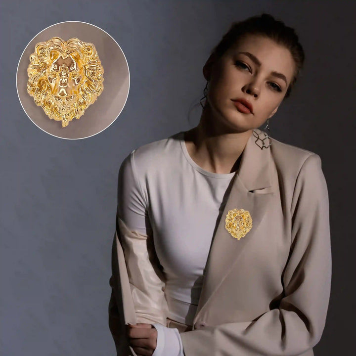 Elegant gold lion brooch worn on a model's blazer, showcasing intricate detailing and bold design