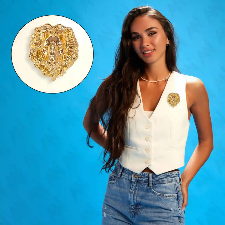 Gold lion brooch featured on a stylish model wearing a white vest and jeans