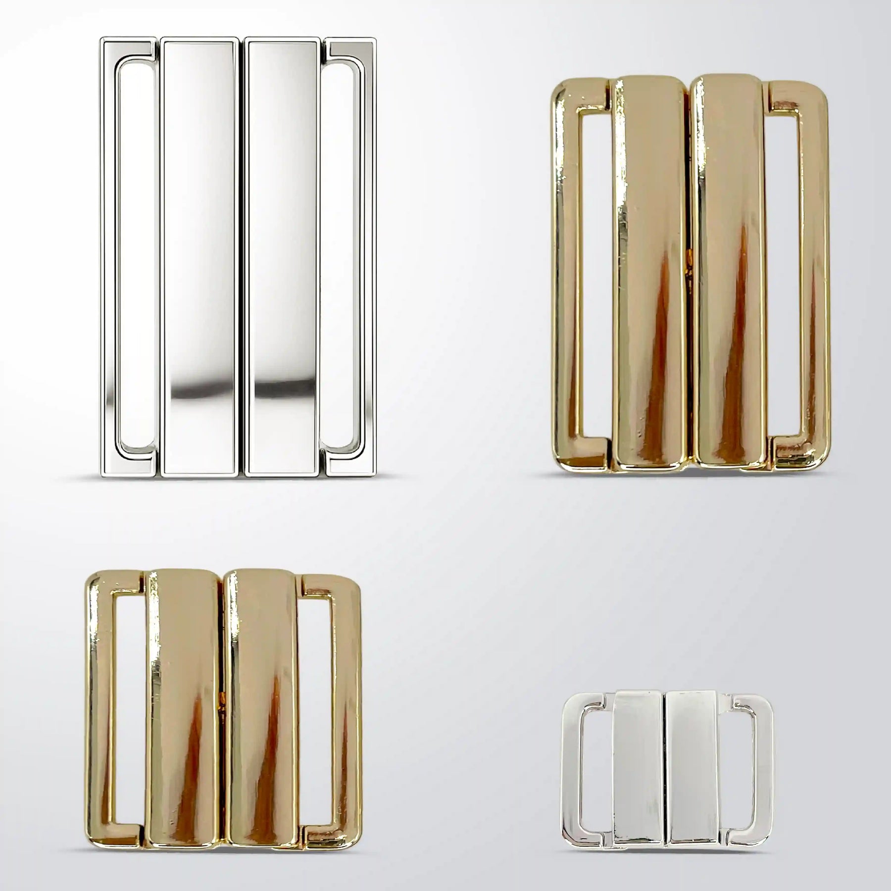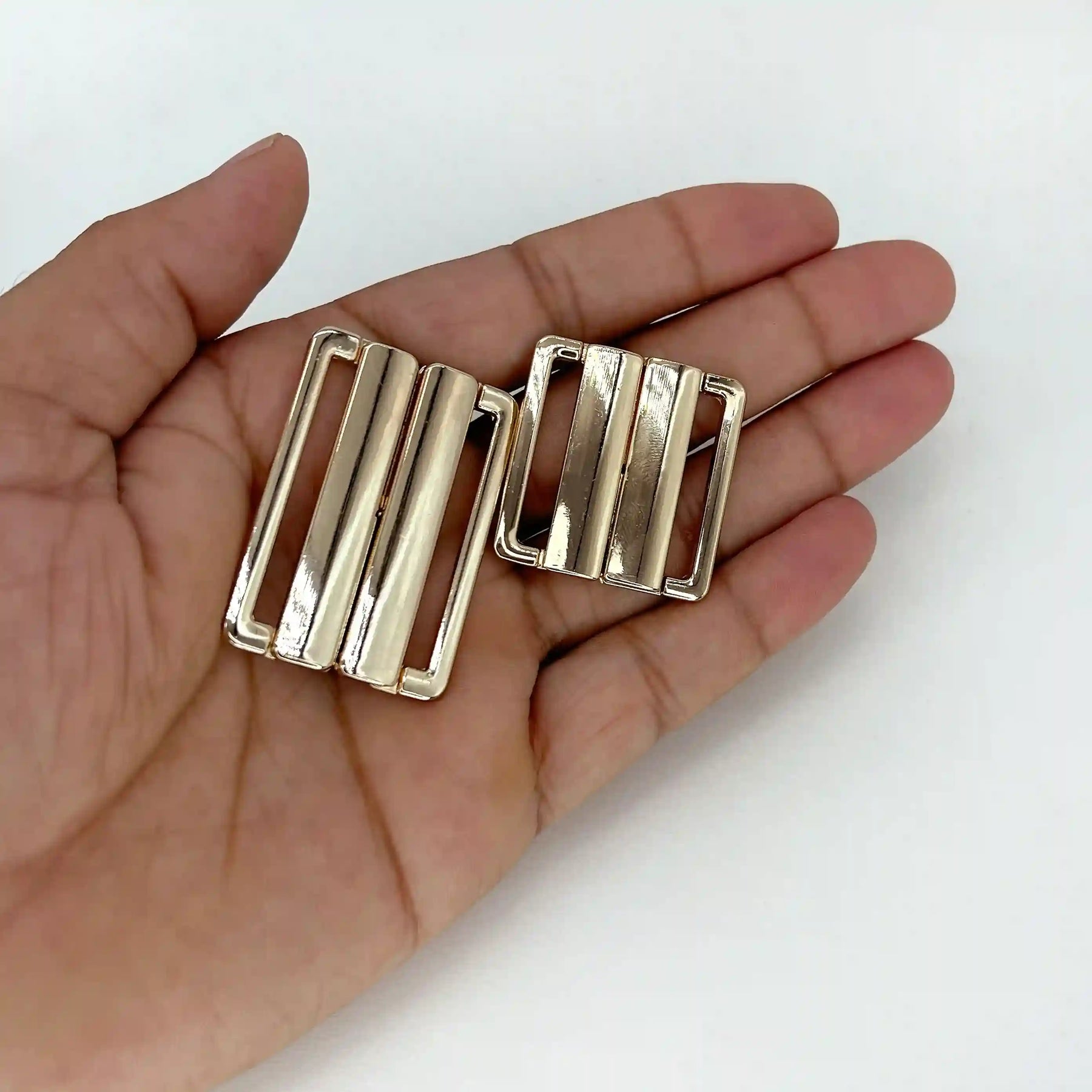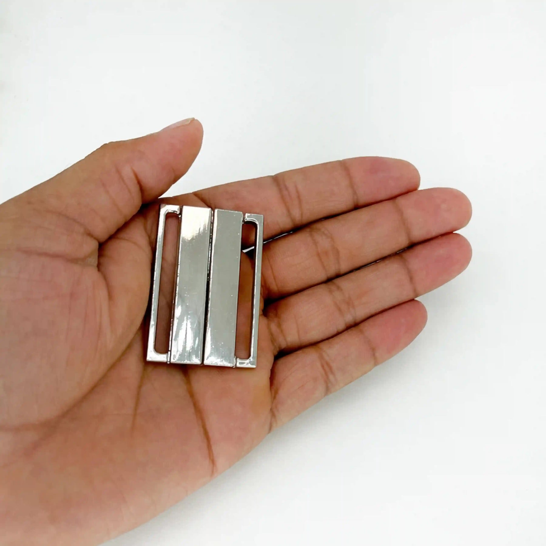 This panelled metal slide buckle features a sleek and modern three-panel design that adds a refined and elegant touch to any garment. Crafted from high-quality metal, it comes in a polished gold and silver finish that offers a premium look with excellent durability. The smooth slide mechanism allows for easy strap adjustment without the need for hooks or prongs, ensuring both comfort and functionality. Its minimalist structure combined with a glossy surface makes it a versatile accessory suitable for both contemporary and traditional fashion styles. Lightweight yet sturdy, this buckle provides a secure hold while enhancing the overall aesthetic of the outfit.