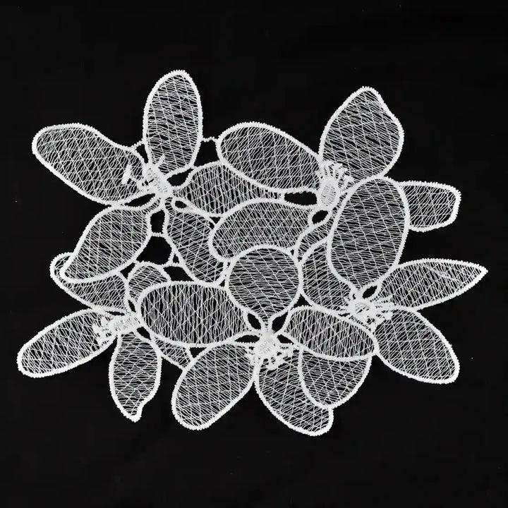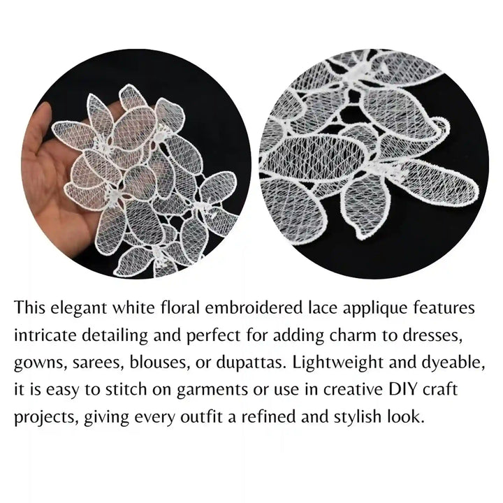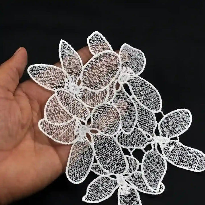These are delicate embroidered lace applique patches crafted on a soft mesh or net base. They feature intricate open‑work designs, often inspired by floral, bow, or ornamental patterns. Lightweight and flexible, these patches are easy to sew or glue onto fabrics and are widely used for enhancing garments and accessories.