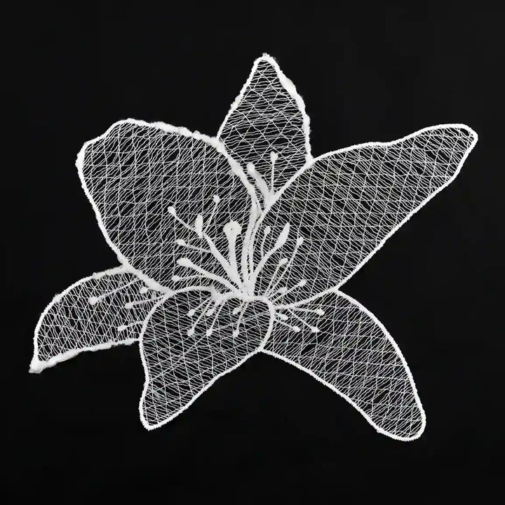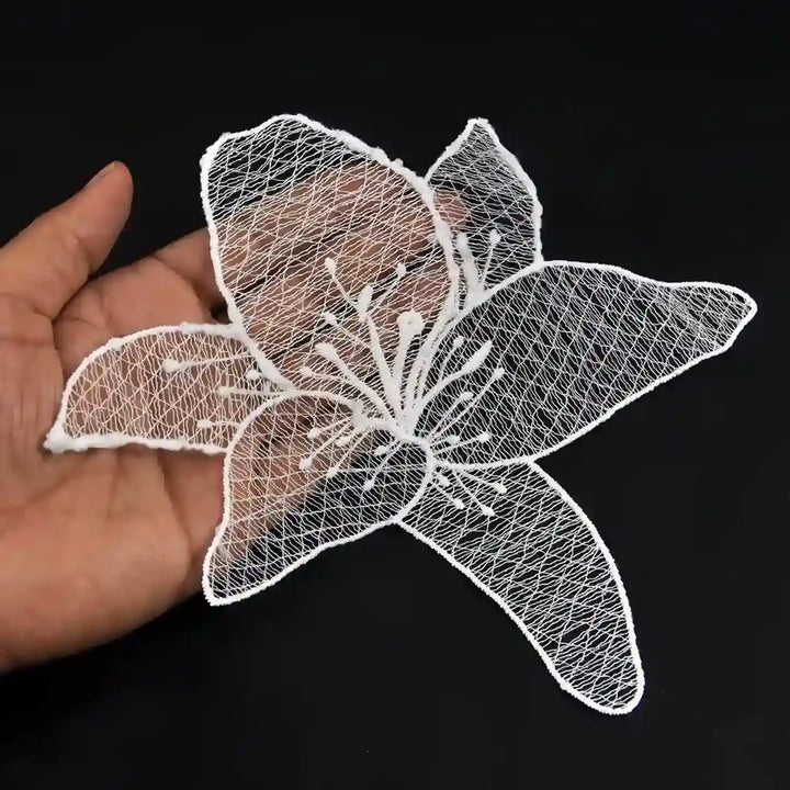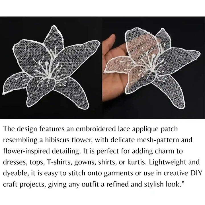 These are delicate embroidered lace applique patches crafted on a soft mesh or net base. They feature intricate open‑work designs, often inspired by floral, bow, or ornamental patterns. Lightweight and flexible, these patches are easy to sew or glue onto fabrics and are widely used for enhancing garments and accessories.