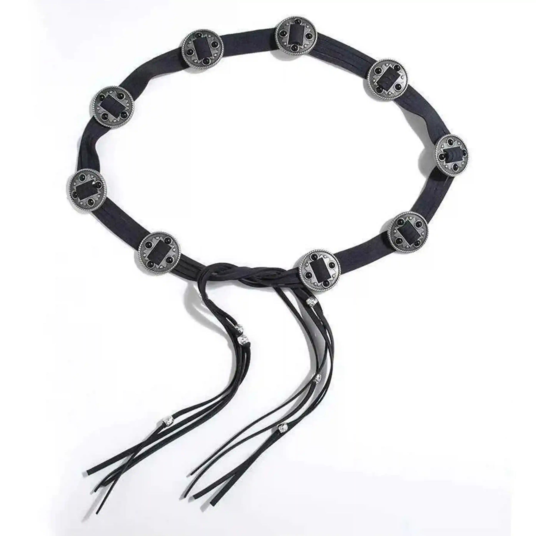 Ani Accessories women’s waist belt made from black suede with boho metal concho accents on a white background.
