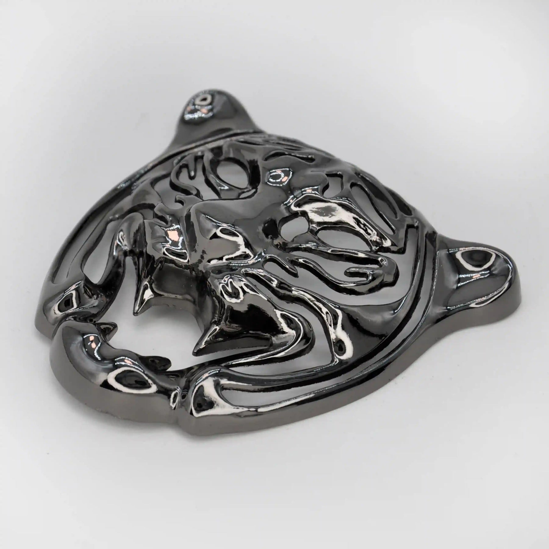 This bold metallic tiger face brooch buckle features a sleek, high-shine finish with a cut-out design that highlights strength and luxury. The fierce expression and polished surface make it an eye-catching accessory, perfect for elevating both modern and traditional outfits.